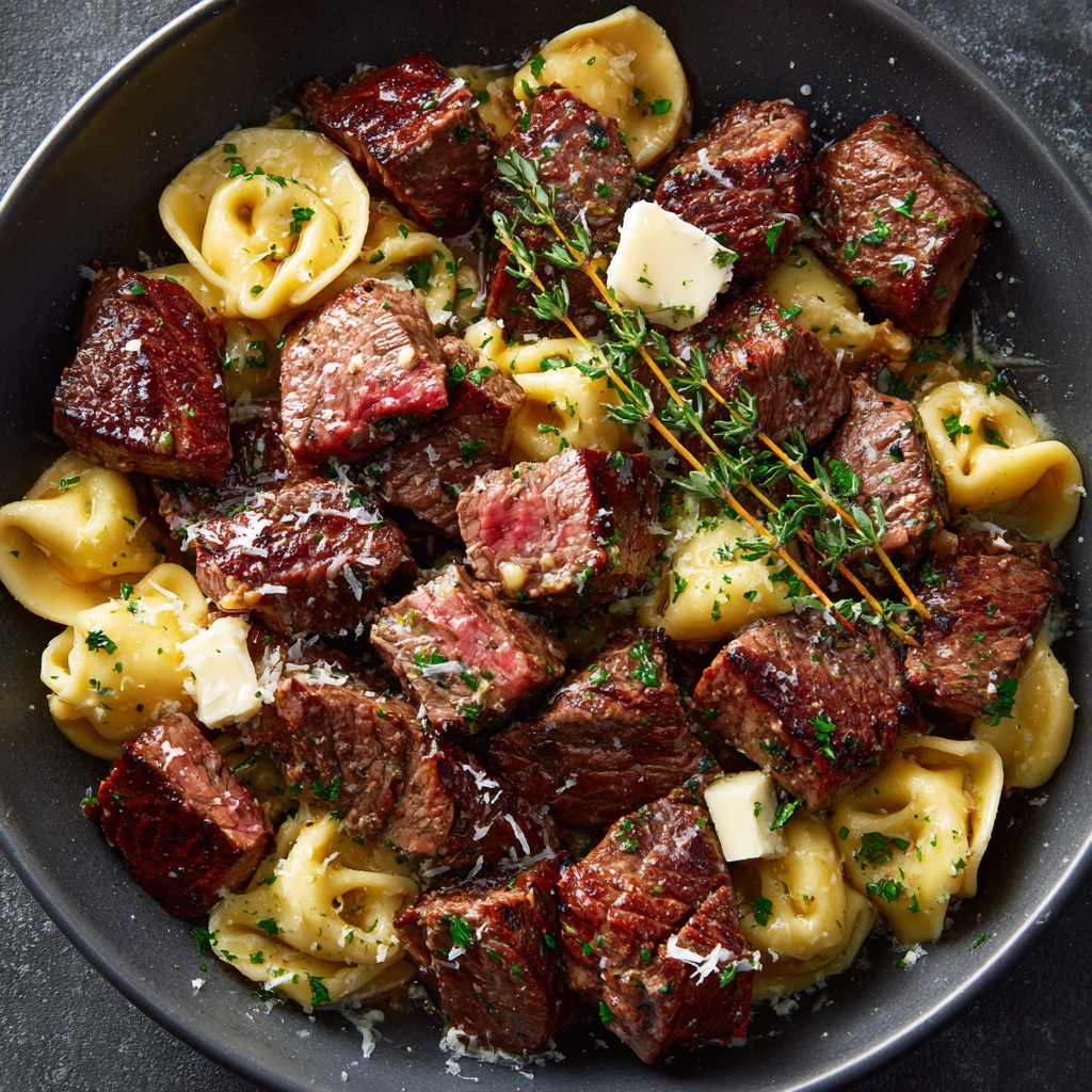 Garlic Butter Steak Bites with Creamy Alfredo Tortellini