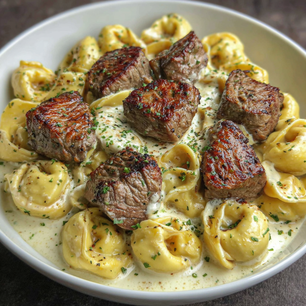 Garlic Butter Steak Bites with Creamy Alfredo Tortellini
