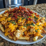 Imagine crispy fries piled high with layers of tender chicken, crispy turkey bacon, and a gooey blend of cheeses, all drizzled with tangy BBQ sauce. It's a feast that promises to impress everyone from family members to guests at your next gathering.